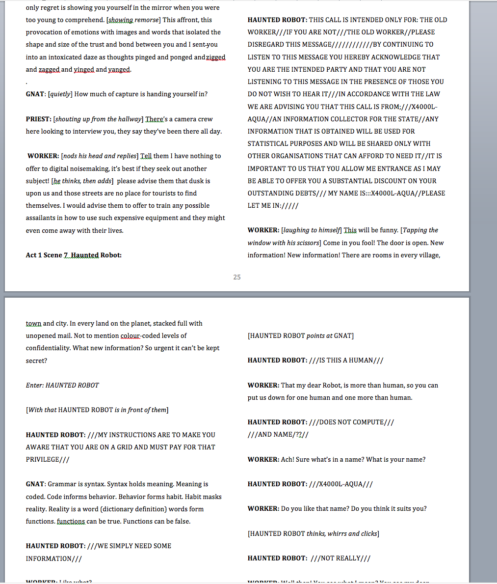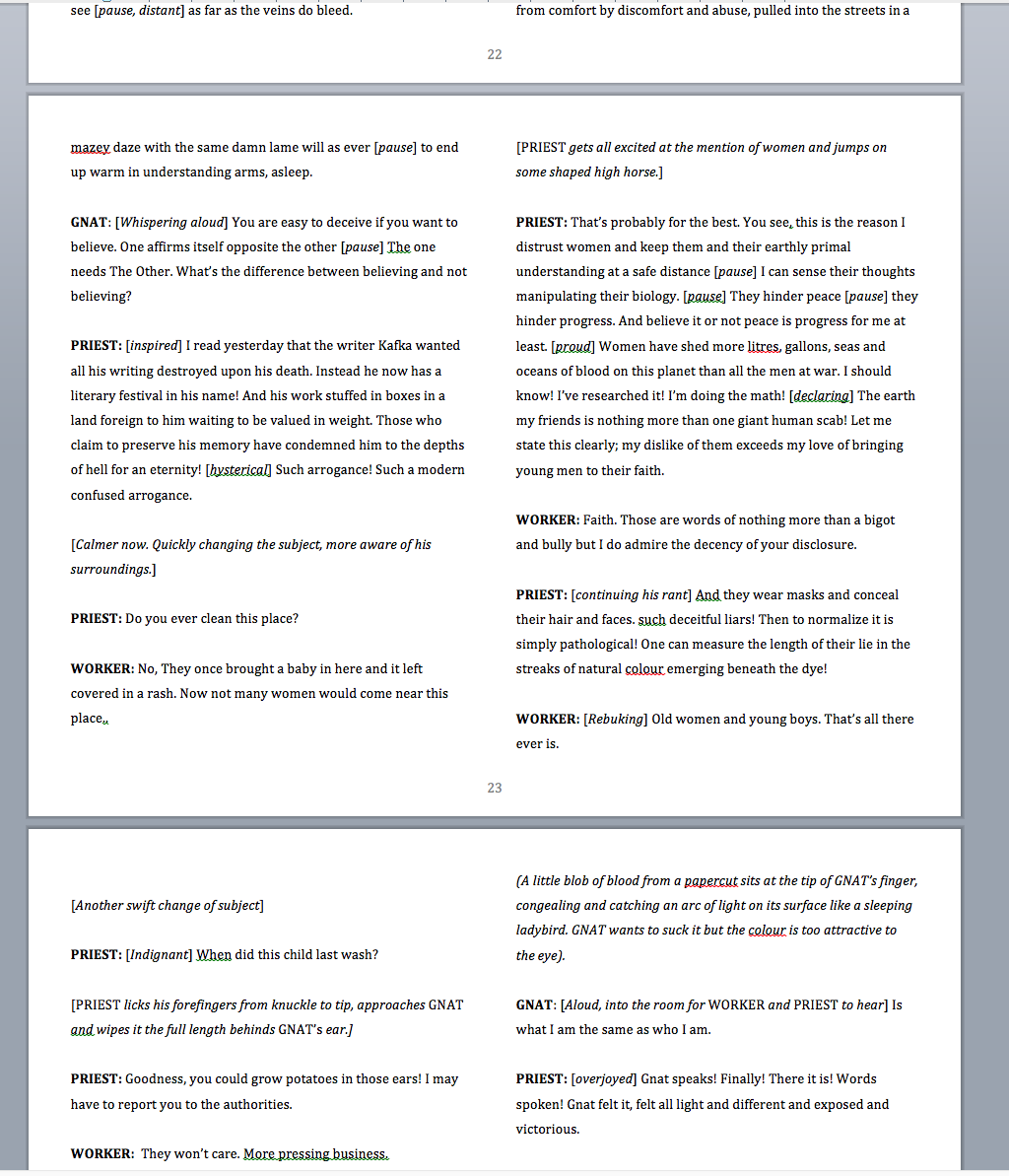 Victorian in feel, we are in the lower depths. There are two workstation desks equidistant and symmetrical slightly forward on centre of stage. GNAT’s desk is slightly upstage of WORKER not noticeable so allowing him to watch unobserved. Upstage right a half open door reveals a filthy toilet next to an equally filthy cooker. Upstage left is a fuse-‐box. A Second door upstage leads to a hallway. [WORKER and GNAT are sat at their desks. WORKER is working away, mumbling to himself, half in song. GNAT is staring out to the audience absentmindedly, tomes of massive books opened out in front of him. WORKER’s words pull him out of his reverie.] The only bright shiny object that can be seen is the sharp scissors glinting and flickering in WORKER hand as he goes about his work with a military industrial complex. It is dark half-‐light on stage a blue light is used to bring out the flashing scissors.